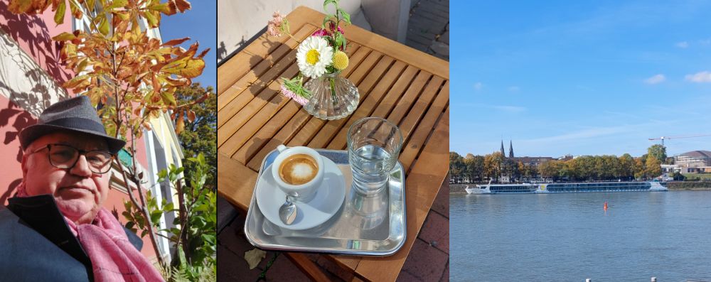 L'automne sur le Rhn, un jour ensoleillée j'ai fait une promenade sur le Rhin, j'ai prix un cafe expresso macchiato et puis je me suis assis sur un bank en bois sur le trottoir dans la ville où j'habite