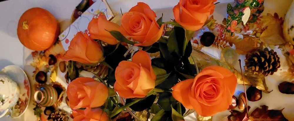Un bouquet de roses avec les couleurs de l'automne fait une belle décoration avec les fruits secs de l'automne