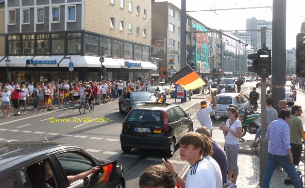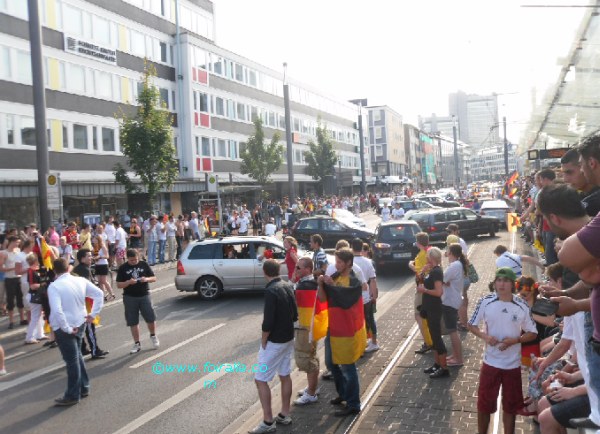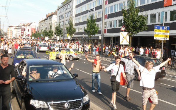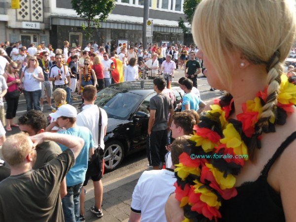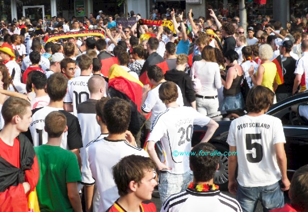 Une marée des jeunes avec des couleurs tricouleurs du drapeau Allemagne, tout à fait enthousiastes en portant d'une main leurs Vovuzelas en main,de l'autre un drapeau allemand ou cigrarette, beaucoup qui se sont s'habiller de T shirt sur le dos le nom de leur préférable d'un des joueurs des membres joures Nationalmeinschaft et la bière d'une autre main. Des des cris de joie, de sauts en haut avec de danse avec un rituel parfois qui atteind l'hystérie et le délire avec le rythme des chansons et des slogans lancés surtout la parole "Deutschland ! Deutschland" qui les a electrisé .