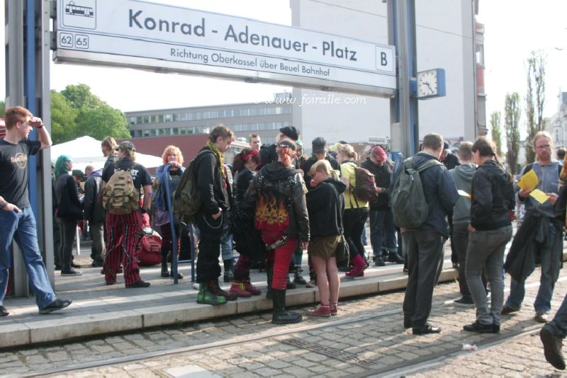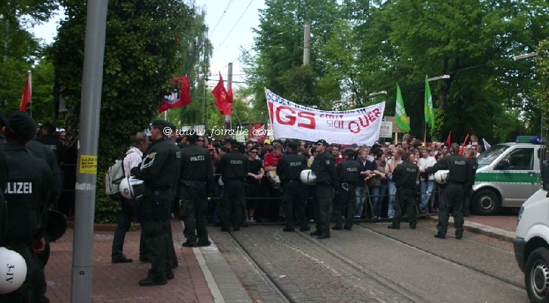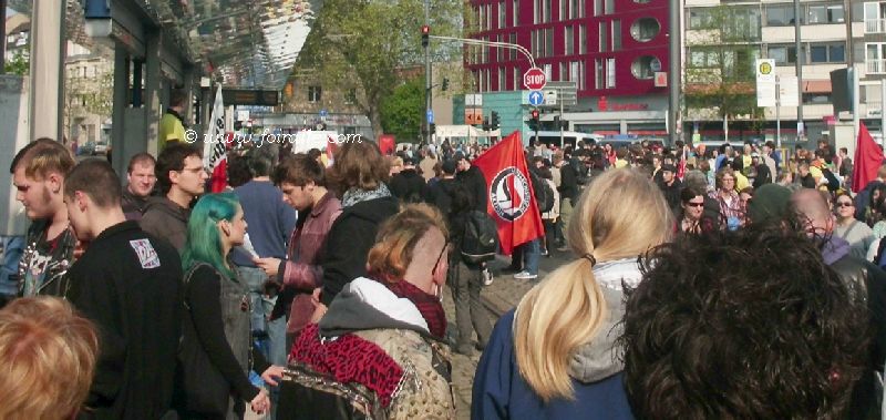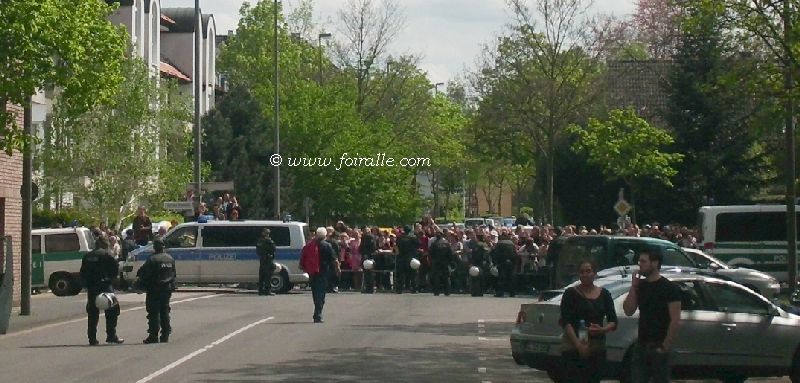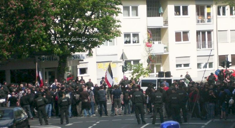 allemande qui fait le choix encore de l'histoire de nationalisme social. Vraiment je suis très etonné pour l'ampleur de la mobilisation de tout le monde contre les manifestants de l'extrême droite allemande qui n'ont pas dépassée quelques dizaines des manifestants et protegés par des plus de 3 mille policiers face á une population pacifique et raz de bol. Mais des milliers des manifestants familles, jeunes, écoliers, enseignants, parents, bébés en poussettes , parfois en compagnie des chiens, groupes spéciaux, culturels, syndicats, associations et certains partis politiques, des gens normales, des habitants de Bonn Beuel. C'est un jour de libération intérieure faite enfin par le peuple qui se mobilise d'en bas et les politiciens local, régional et fédéral où sont-t-ils dans la réalité des faits. Seulement les discours derriéres les télévisions qui restent comme paroles paroles. Il faut le dire tout carément que le peuple d'en bas et des associations qui ont pris l'inittiative. Même le Maire de Bonn et les candidats aux élécations régionales de NRW ne sont pas apparues parmi les manifestants. leurs placards de compagne éléctorale ont été psésents avec des sourires qui restent artificiels et mécaniques impressionnés sur les placards. Je n'ai pas vue aucunes banderoles ou placards des militants de CDU et FDP qui sont de la colation du gouvernement fédéral