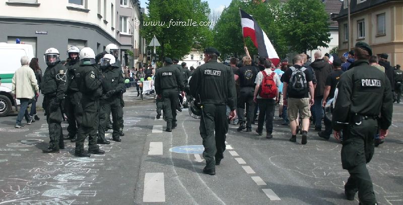 les extémistes allemands en marche vers le retour á la gare de Beuel, encadrés par la police ou protégés contre la colère de la population!