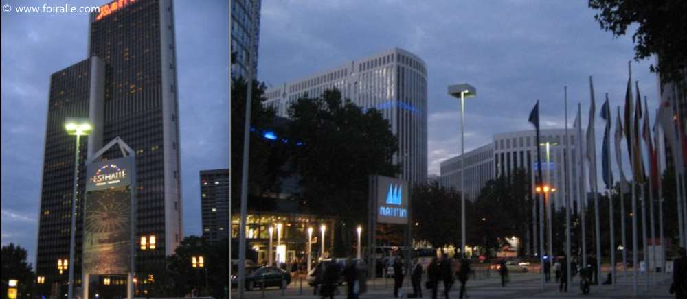 Le parc des expositions et salons de Francfort Messe Frankfurt est entouré par une infrastructure très moderne avec des hauts immeubles comme aussi des hotels et des centres de congrès et conférences.