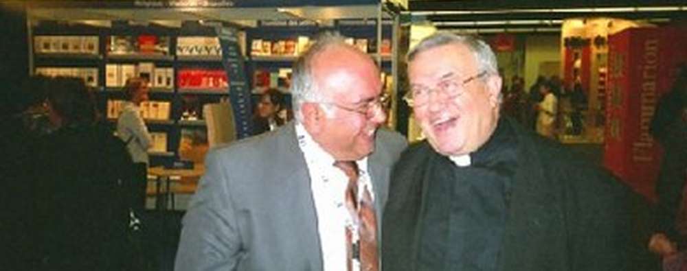 Dr Gabriel El-Lakkis au salon du Livre à Francfort Frankfurter Buchnmesse rencontre spontanée avec le cardinal de Main Lehmann aussi président de la conférences des évêques catholiques de l'Allemagne dans le département des livres francophones. Il était un homme hautement cultivé. Il était une grande figure religieuse dans l'histoire contemporaine de l'Eglise allemande