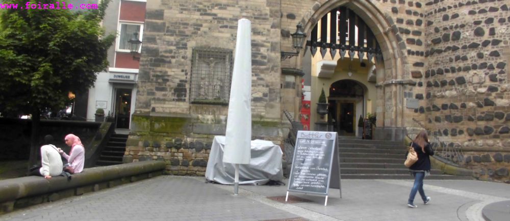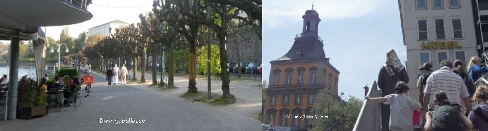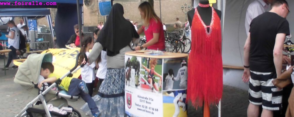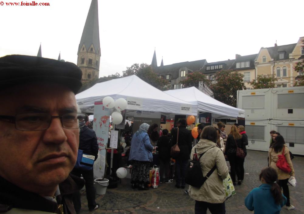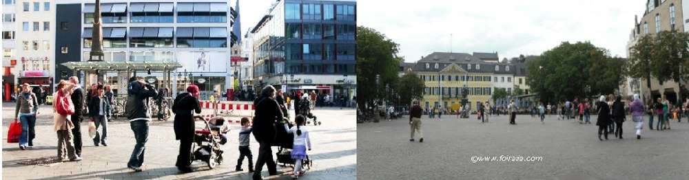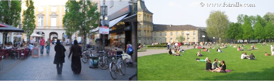 Bonn Rathausplatz des familles musulmanes en promenade, même sur le pont du Rhin tout change de la rive gauche á la rive droite. Les vétements de filles musulmanes est à la mode avec le jeans et les couleurs avec les accessoires. Dans les places publiques l'apparition des stands qui font appel à la conversion musulmane des chrétiens allemands et européens