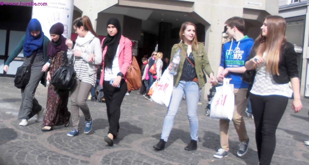 Nouvelle génération en Allemagne: Différences évidentes dans la mode, harmonie de facade, mais le temps pourrait faire prévaloir les profondes différences en culture et foi religieuse, gastronomie et habillement, moeurs et lois, mariage et divorce. Elle est belle l'amitié entre les jeunes élèves en shopping et aussi d'être des camarades de la même classe. Mais les différences religieuses et culturelles seront apparaître bien un jour incompatible avec la société et l'État de droit en Allemagne qui m'a favorisé l'auto-intégration! Il suffit de comprendre à travers les habits et les sacs en main, car pour certaines on n'achètent pas dans les magasins parceque les propriétaires ne sont pas de la même religion. On est au coeur du future début 21e siècle. Peut-être le futur est déjá tracé selon mes impressions ! (Vielleicht ist die Zukunft schon durch meine Eindrücke auf dem Plan gemacht oder besiegelt !