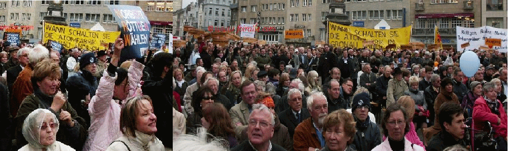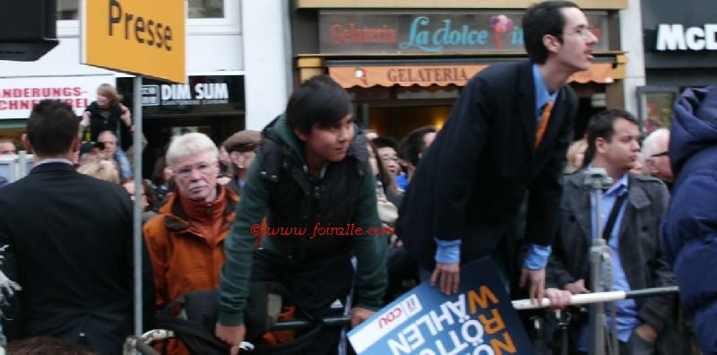 Voilà que durant le Meeting d'Angela Merkel pour les militants et amis de son parti CDU, ce que j'ai vu derrière moi une population en majorité de tête blanche les cheveux blonds ne sont plus visibles, et il n'y a que de peu des jeunes. Derrière les militants de CDU participants au Meeting electoral Angela Merkel et Norbert Röttgen, des placards des opposants militants écologiques et de Linke et autres de l'extrême gauche qui ont cherché avec des siffles, des cris et des bruits avec tambour et vuvuzela a déranger. Ce qui ont manifesté contre étaient la plupart des jeunes gens. mais dans ce genre de Meeting, dans l'esprit de la démocratie et de la liberté on respecte la manifestation electorale de l'adversaire entre le droit à la manifestation et le droit à la campagne electorale de son propre parti pour les élections, ce n'est plus de la démocratie ,mais plutôt d'anarchie idéologique, sociale et culturelle futuriste voilà une nouvelle génération allemande avec des autres origines, formes physiques ou races et religions qui s'émergent ces dernières années . Voilà de "l'ante portas à l'intra muros" le changement démographique, ethnique, culturel et religieux est déjà à son processus est en train de faire d'atteindre son point culminant avec la formation des autres partis issus de générations immigrées surtout les turcs-allemands