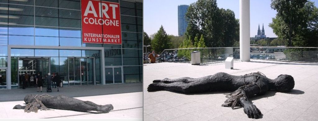 La visite de l'Art de Cologne une statue de bronze qui jaccente sur la parvis à l'entrée du Parc d'exposition de Kolenmesse ce qui m'a choquée de voir une statue de un homme mort par terre avec des est-ce ceci que l'art refléte la situation et l'état de la culture, société voire la civilisation. Pour certains visiteurs comme une chose macabre à l'entrée du Parc d'exposition du Süd Hallen de Koelnmesse certains visiteurs ont reçu un choc artistique. Le fait de voir par terre une sculpture de bronze inspirée de la mythologie grecque Icare - Ikarus oeuvre de l'allemand Stephan Balkenhol. Est-ce qu'il s'agit de la tragédie de la mort ou de l'anéatissement causé par l'homme lui-même à travers ses oeuvres et sa volonté d'aller d'aller plus loin dans ses désirs jusqu'à le risque d'anéatir son existence. car l'homme est limité même s'il est tendu par nature et instinct d'aller au-delà Dr Gabriel El-Lakkis © PHOTOS FOIRALLE