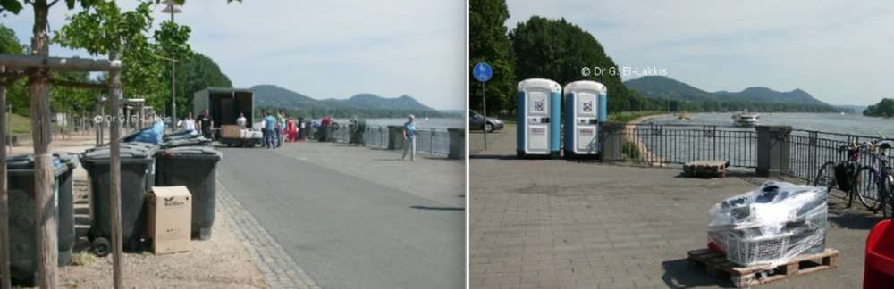 Alors dans notre promenade sur le Rhin des choses que les déchets ont été élevé si vite d'une manière incroyable. Même une camionette était en va et vient pour transporter les déchets desrestes de centaines et milliers de spectacteurs un peu plus loin sur Bonner Bogen du personnel était en train de lever les reste de la logistiques. Car des tonnes de déchets et des restes de l'événement qui ont été transporté des lieux pour garder cet endroit propre et hygiène Des déchets ressemblés avec discipine pour l'emporte ainsi on gardait les lieux propres malgré les déchets et restetes des milliers de personnes