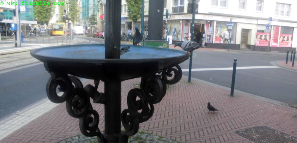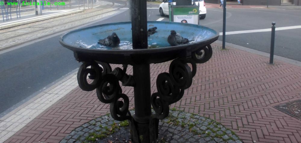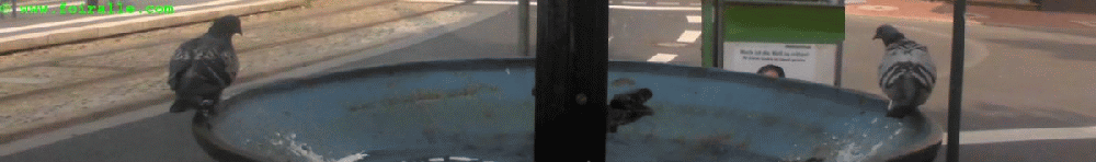 Les pigeons qui se baignent dans la fontaine dans la rue tout à côté de chez nous dans un mouvement de va et vient