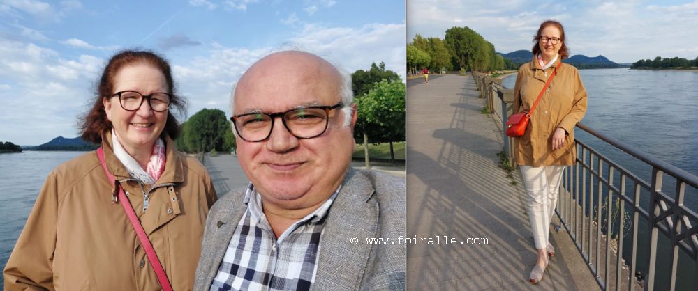 Voilà on était vers 19h j'ai pris avec ma femme un apéritif Hugo sans alcool pour moi et un autre apéritif Aperol pour ma femme dont ce drink est à la mode avec le vin rosé. On a mangé dans une belle ambiance d'amour et d'amitié dans resaurant au bord du Rhin. Une localité qui se trouve à Bonn Ramersdorf et qui me plaît beaucoup qui donne sur les 7 Montagnes - Siebengebirge et Drachenfels - Mont du Dragon, moi je l'appelle "le Mont de l'Amour" avec Mythe >>>>