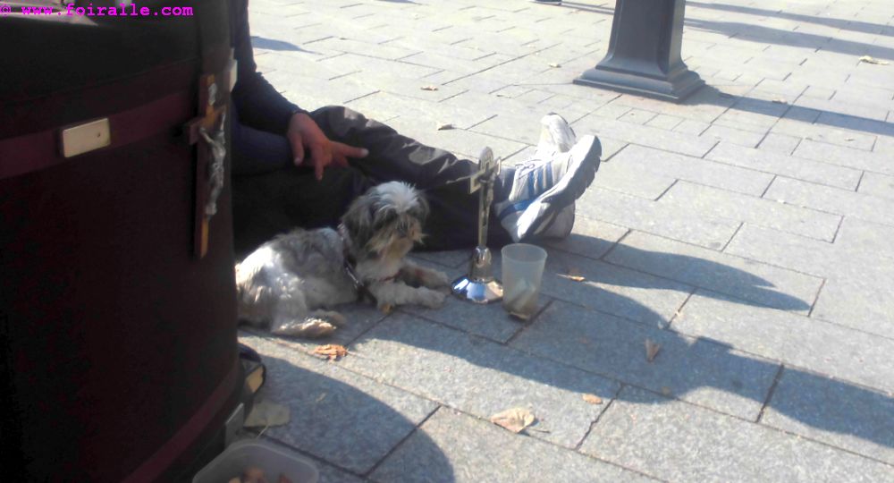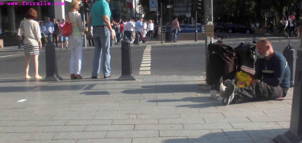 Un des pauvres ou des clochards de Düsseldorf (Obdachloss) est assis sur un angle de la rue-boulevard avec un joli chien et fidèle et deux croix de Jésus-Christ crucificé. Persoennellement jamais des icônes ou des signes sur le Christianisme_ Les clochards allemands (Obdachlos) n'ont jamais porté avec eux des croix ou des icones de la Sainte Vierge mais ca pourrait être d'un polonais immigré qui est tombé dans une disgrâce tout en pensant que l'Allemagne est un paradis de l'immigration