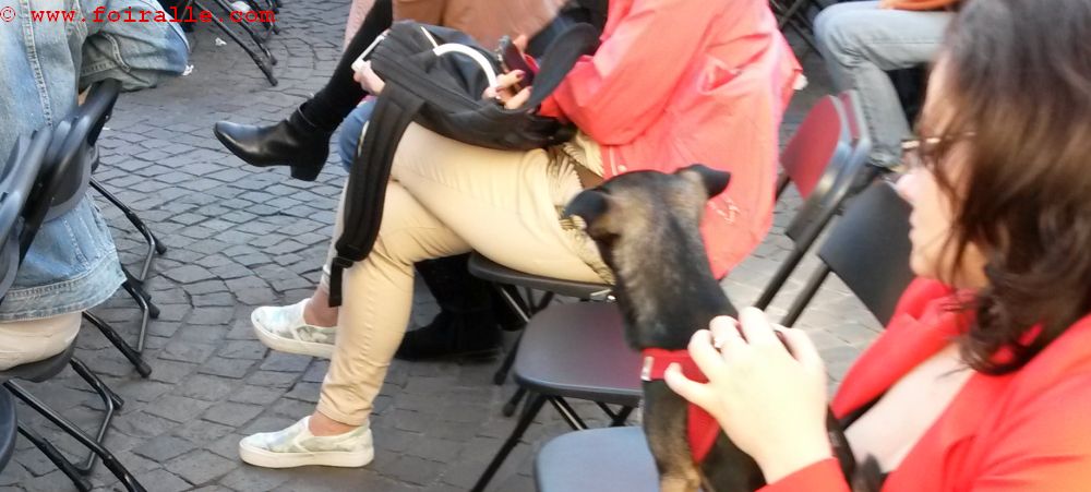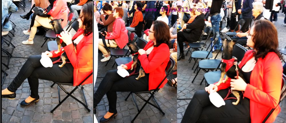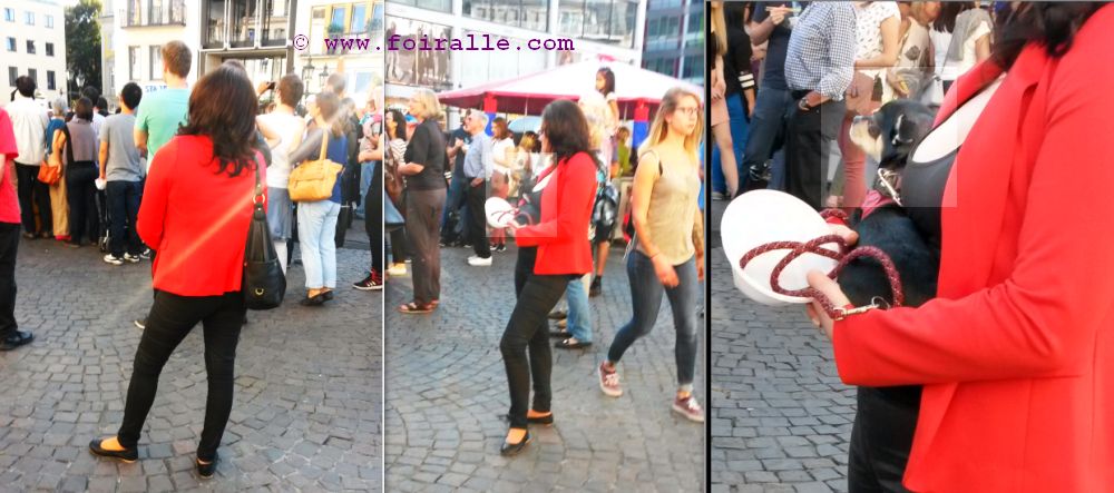 Le petit chien et le charme féminin jacket rouge et pantalon noir un peu de glamour public