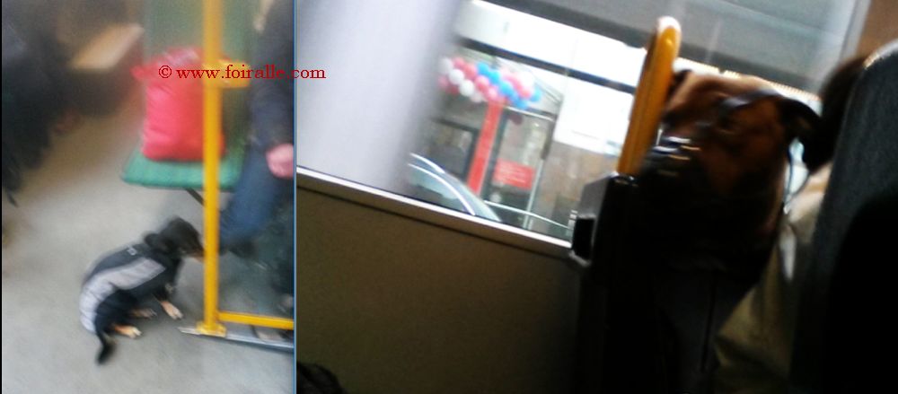 Les deux chiens dans le tram transport public, le féroce qui fixe un petit chien