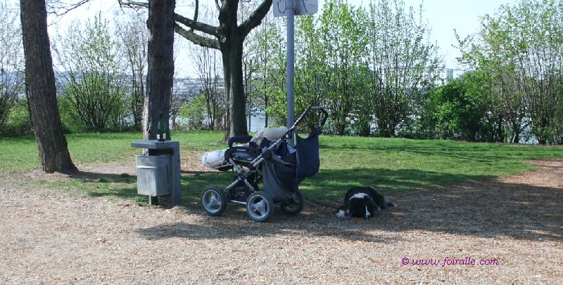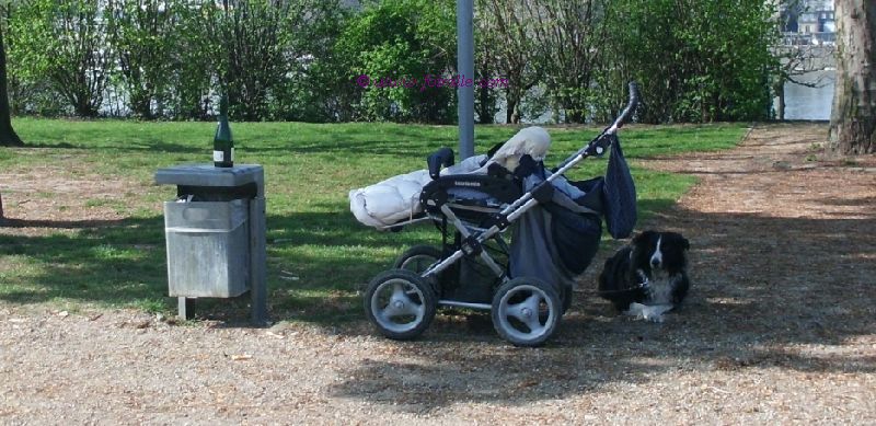 Le chien gardien de la poussette du bébé à côté de la poubelle, á peine que je me rapproche de lui. Quelle impression me commentait une allemande: Un chien une poussette une boutueille de vin mise sur la poubelle c'est typioque de pays de la région du Rhin