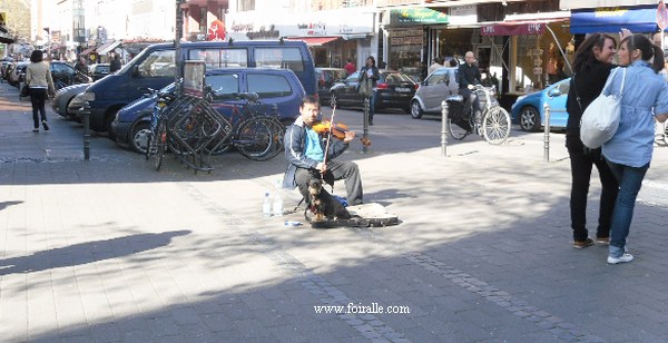 À Cologne un jour de soleil, le chien, la musique, la violencelle, le violoniste et les passants