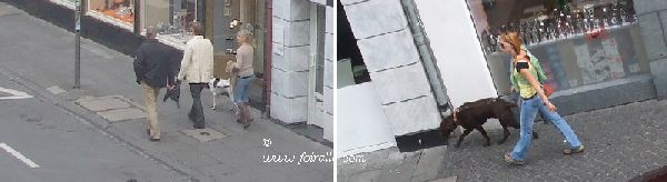 ce chien avec son propriétaire qu'est-ce qu'il ? qu'est-ce qu'il observe ? sauf les traces qu'il laisse sur le trottoir !