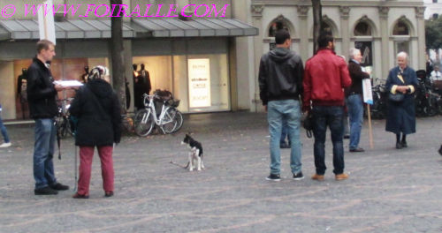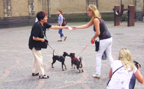 Gentillesse avec un étranger Auslander Non ? Mais collaboration spontanée pour la merde d'un chien au milieu de Bonn en bas. Le salut instinctif et social des chiens à Bonn Münstebasilika Platz avec les odeurs á travers les nez (code d'information pour les chiens) les deux dames qui ne se connaissent pas, mais une dame vient en aide à l'autre en lui offrant un petit sac hygiènique de Picco bello et une blonde fait la photo. C'est un bel exemple d'intégration entre allemands et allemands d'origine étrangère. Combien est belle la collaboration spontanée et l'entraide entre les êtres humains de différentes races et cultures qui vivent sur le territoire allemand ! impossible ou possible ...