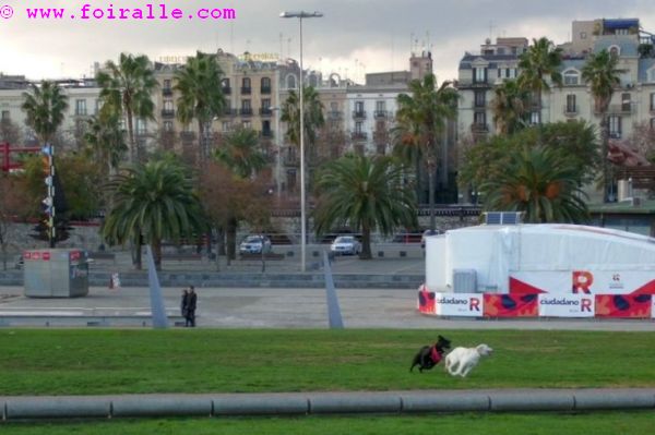 Les chiens de Barcelone qui se rencontrent et jouent ensemble sur les gasons du Port de Vell de Barcelone en face au yacht club royal. Ronda del Litoral >>>>