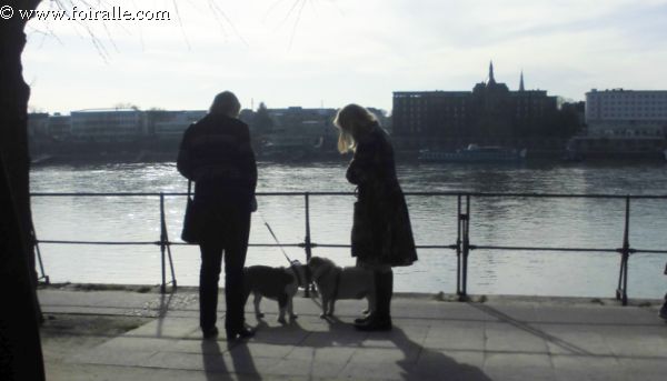 Deux femmes, deux chiens en promenade sur le Rhin, spectacle habituel