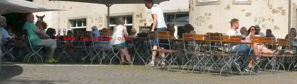 Just on time la merde du chien devant les tables des clients de la terrasse d'un restaurant nouveau sur le Rhin. Civilté Caca Chiens et les propriétaires >>>> * Bonn Beuel localité de Promenade, Rhin Boulevard de la Merde et déchets des chiens sur le Rhin>>>>>