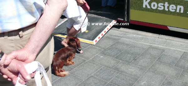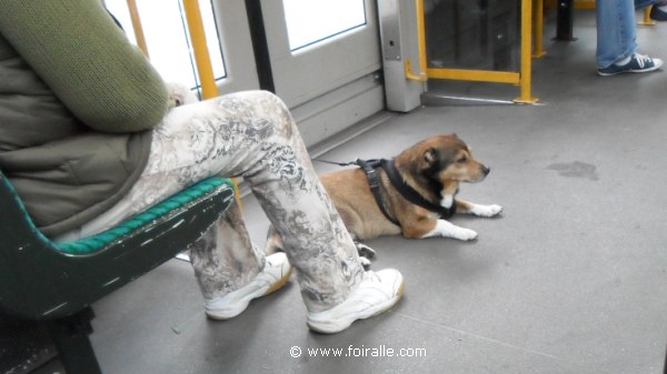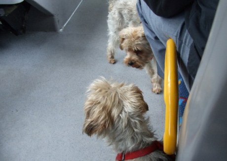 Les deux chiens dans le tram transport public, le féroce qui fixe un petit chien >>>>