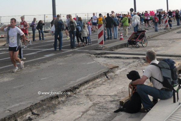 marathon et le chien qui obserbe. Une chien observateur les marathonistes, la caravane de marathon á Bonn passe et le chien labarador observe et regarde !