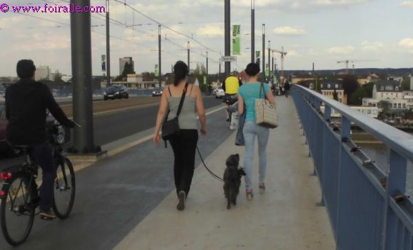 Un chien orgueilleux de marcher entre deux belles filles sur un pont du Rhin en jeans bleu et et noir !!!