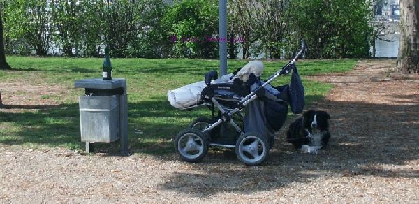 Le chien gardien de la poussette de bébé à côté de la poubelle et une bouteuille du vin vide typique du pays du Rhin comme une allemande me le disait >>>>