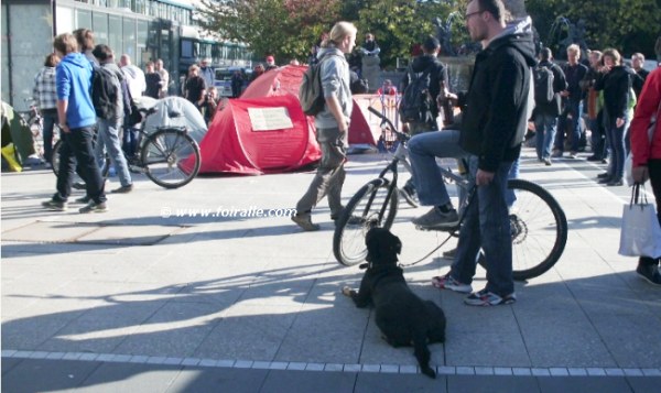 Typique allemand de ces temps, une manifestation contre la crise de l'euro à Francfort, mais un individu en jeans avec son vélo et l aboutielle de bière en main et le chien se repos devant lui en dialogue avec quelqu'un !