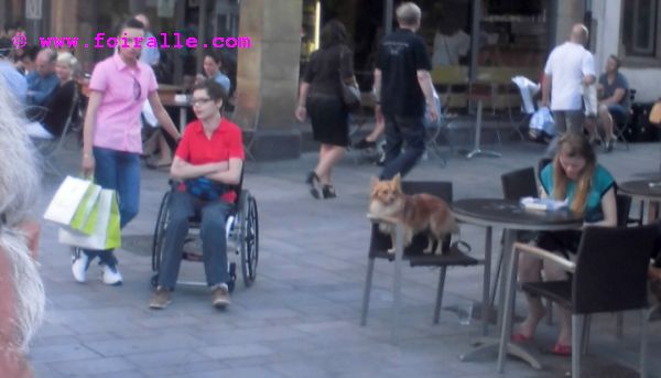 Il est mignon ce petit chien sur la chaise du café trottoir. Égalité et fraternité, sur un café trottoir à Duesseldorf Alstadt, un spectacle m'a attiré l'attention un chien debout sur une chaise comme les autres clients du café. à côté de lui une femme handicapée sur une chaise qui regarde vers le lieu d'où des cris qui se dégagent... Oui j'aime les chiens et les chats ce sont des créatures de beauté et de compagnie