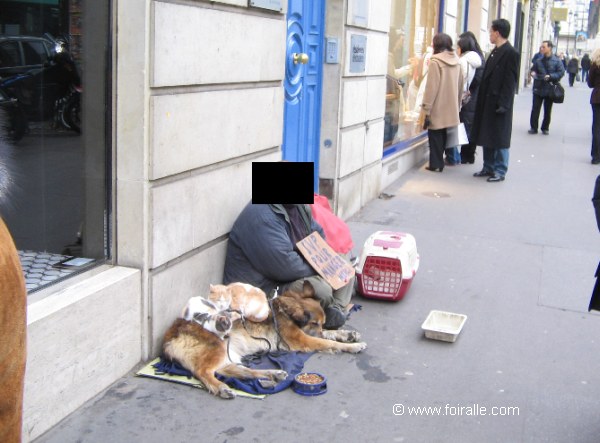 La pauvreté ressemble dans le destin amitié et émotion entre chats et chien dans une rue de Paris entre Madeleine et la Place de la Concorde