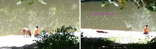 Promenade sur la rivière: Un chien ennuyé, une femme parle avec son phone portable, un soleil et de chaleur >>>>