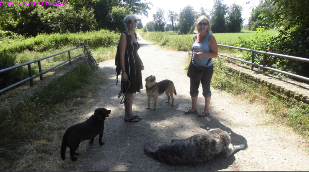 Mon Blog "le Pont des Chiens - Bridge dogs - ponte dei cani - HundenBrücke " dans environnement naturel "petit oasis"humains et chiens inspiration, que je l'appelle car je voie le passage des dizaines des chiens chaque jour pour la promenade quotidiennne avec leurs propriétaires. Me voilà j'étais sur "le pont des chiens" et voilà deux femmes en compagnie de trois chiens bien socialisé ce que les gens en Allemagne ne son pas encore socialisé face aux inconnus qui leur partage leur existence depuis plus de 50 ans, ou 20 ans comme moi. Un jour il faisait chaud dans le pays du Rhin pendant mes vacances |