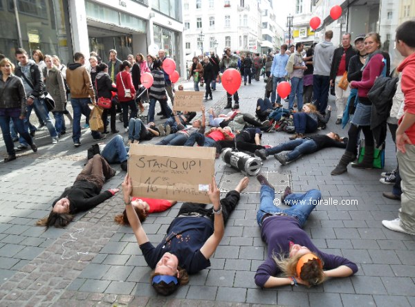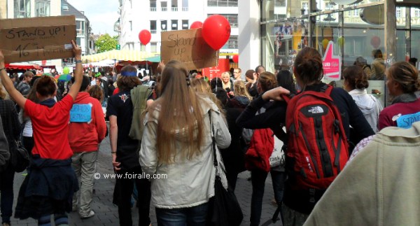Ces jeunes universitaires de différentes facultés de l'université de différentes nationalités et ethnies se sont manifestés au centre de Bonn contre la pauvreté qui augnmente et ils soulèvent de leur difficultés de pays les priux universitaires qui ont augmenté. Ils n'ont pas des appuis importants comme le gouvernement a financer les banques qui ont causé la crise ecionomique mondiale et aussi en Allemagne