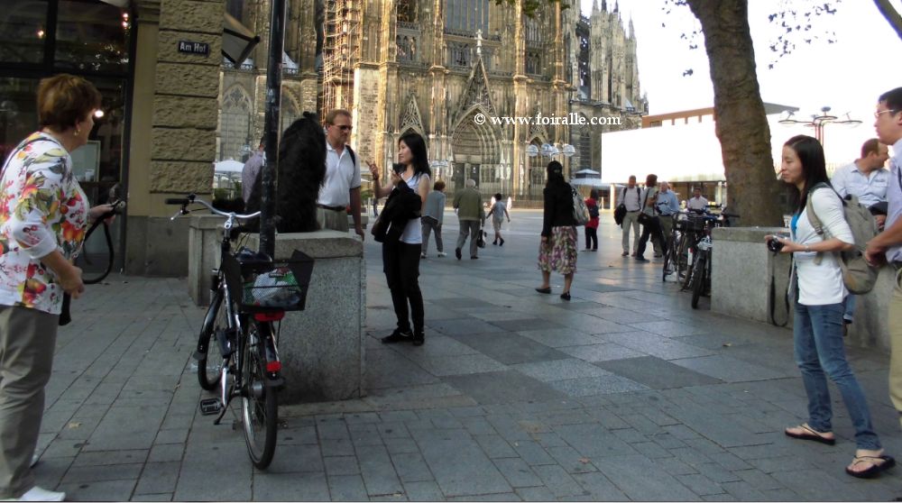 Le voilà quand j'ai attraversé le pont Köln Deutz en passant sur le philharmonie Museum et cathédrale devant l'angle de l'hotel et de Früh kölsch voilá des touristes chinois deux femmes et un homme aussi une femme voilée avec son fils me semble des pays arabes. Les chinoises prises par une forte émotion pire que les émotions des italiens vers l'ours chinois Panda de prendre une photo de souvenirs avec le beau chien bien soigné et éduqué par son propriétaire. terminés le sphots de souvenirs avec esl cameras