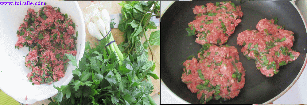 une demi kilo de viande hachée avec un petit bouquet de persil avec une menthe et un oignon bien coupé en morceau trés fin avec le couteau ou un mix électrique, ajoutez à la viande hachée des épices 7 poivres masser et mélanger (vous pouvez mettre de coriandre un peu, de thym ou rosmarine de tré speu de quantité discrète au bout de bois et faites les mélanger avec la main et üpuis les faire préparer selon le volume et la forme désirée .