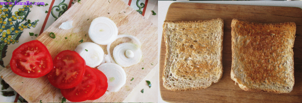 Deux morceaux de toats grillé sur un appareil et puis une piéce de tomate et oignon coupés en tranchés bien mesuré