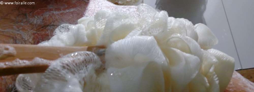 Pour les salles de bains et de la douche, l'utilisation des éponges de douche qu'on les appellent "Fleur de douche" faites en fibre avec manche longue en bois ou sans bois