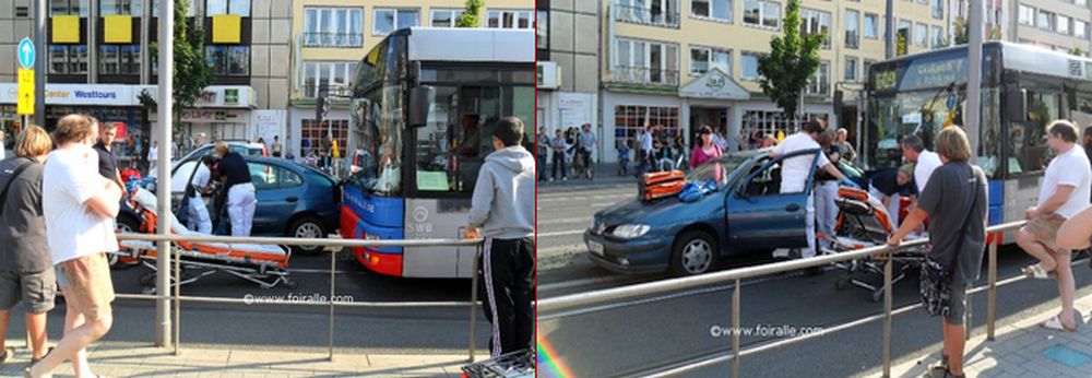 Bonn accident de Bus SWB Bertha-von-Stuttner-Platz samedie 14 août 2010 avec une voiture d'un africain, intervention ambulance médecins de secours NOTARTZT. Intervention professionnelle de l'ambulance >>>> >>