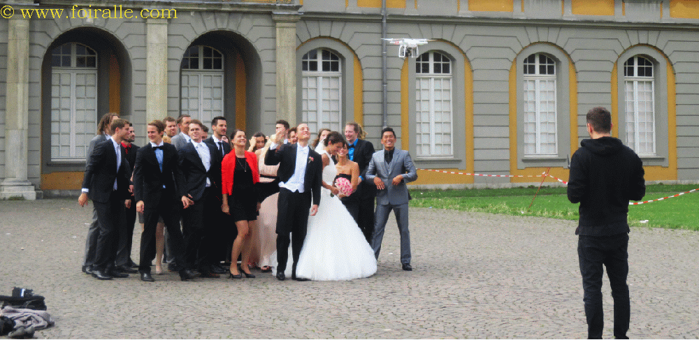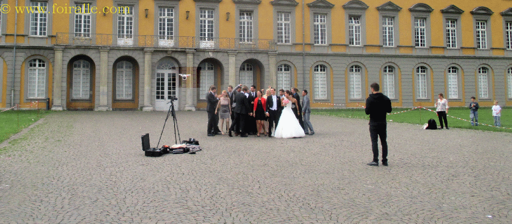 Comme ici le mariage des jeunes étudiants dans une ville en Allemagne, un photographe qui pilote un drone à distance pour des prises de vue aériennes en captant les images et photos impressionantes © FOIRALLE