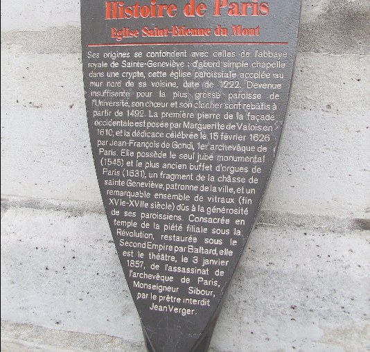 en marbre à l'entrée de l'église Saint-Etienne-au-Mont on trouve un placard qui explique d'une manière brève l'histoire de cette église et ancienne Abbaye de Sainte Génévièv |