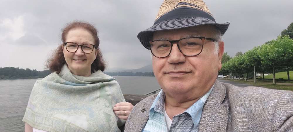 Voilà nous deux au bord du Rhin malgré la pluie, le brouillard et les nuages on a trouvé le Rhin romantique dont la beauté de la nature s'est manifestée. On était pour aller dîner ensemble dans un restaurant à Bonn Beuel avec nos amis invités pour célébrer mon anniversaire. Mais nous deux nous aimons prendre quelques photos et selfies dont le Rhin est le témoin de notre histoire d'amour depuis 1990.