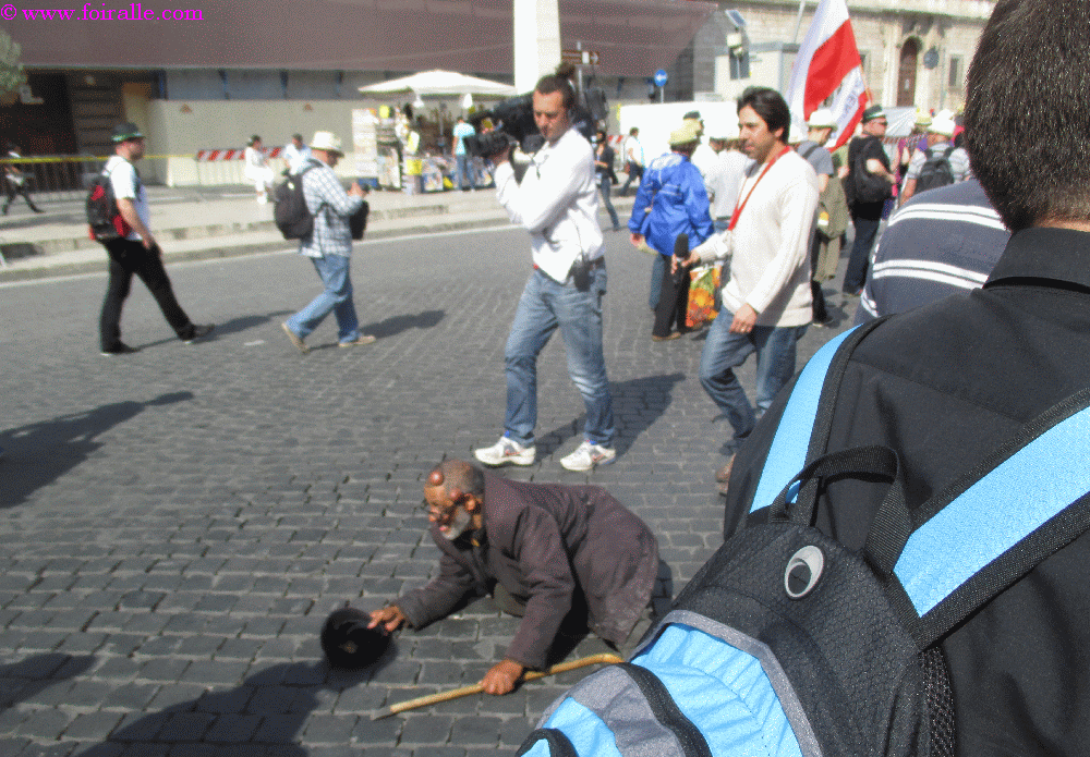 e RomeUn spectacle ui m'a secoué fortement un homme pauvre, invalide, malade qui a un peut-être un virus ou maladie dans son corps qui ne marche pas mais qui essaie de demander élemosine de ces pélérins qui passaient devant lui par dizaines durant la canonisation de deux papes saints Jean XXII et Jean-Paul II